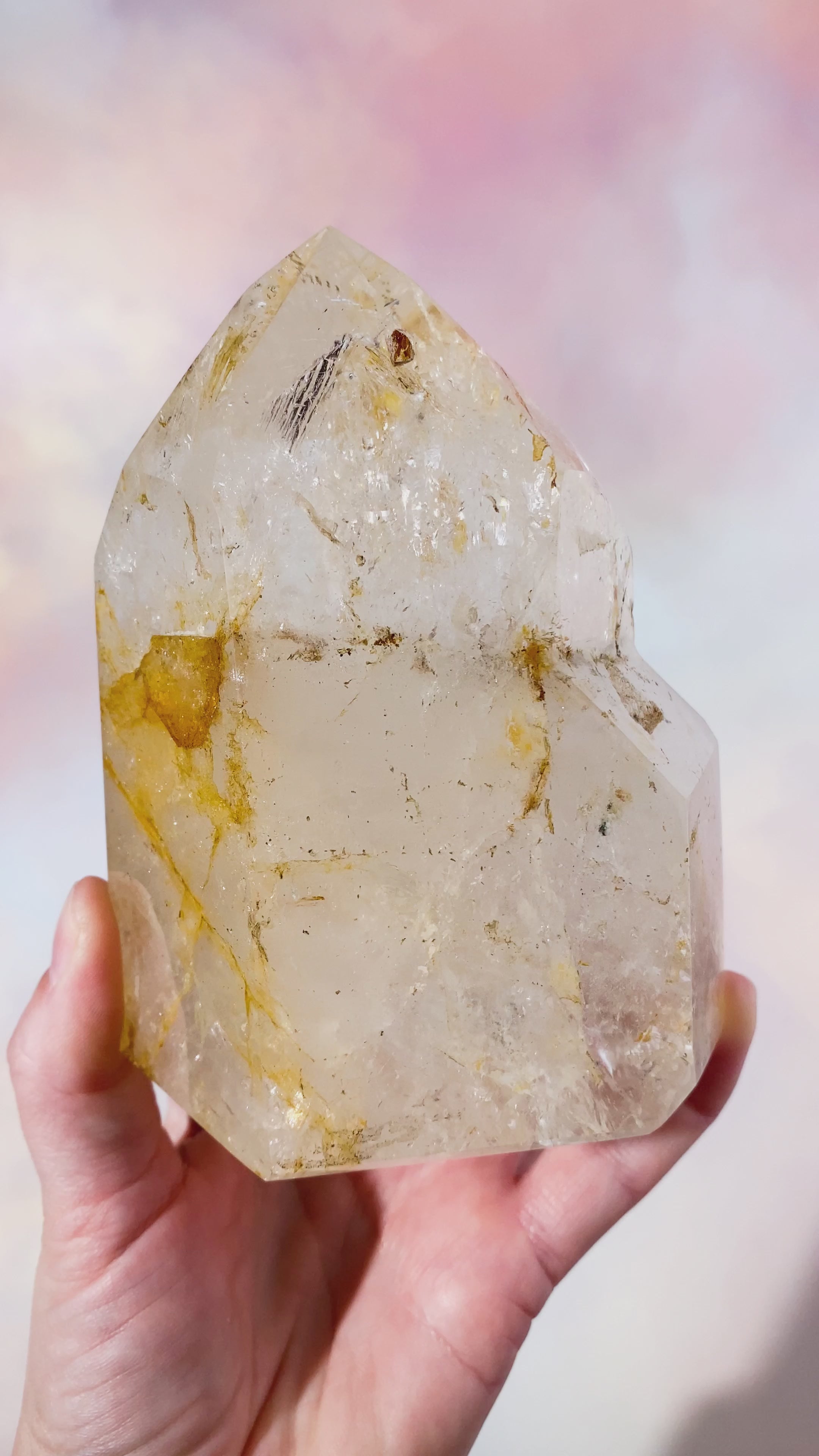 Det här är en av de mest förunderliga och fascinerande exemplar vi någonsin har kunnat erbjuda: Ett stort gyllene bergkristalltorn med inkapslad vätska. Miljontals år gammal vätska, vill säga. Det kallas enhydro och är både extremt sällsynt och extremt dyrbart.